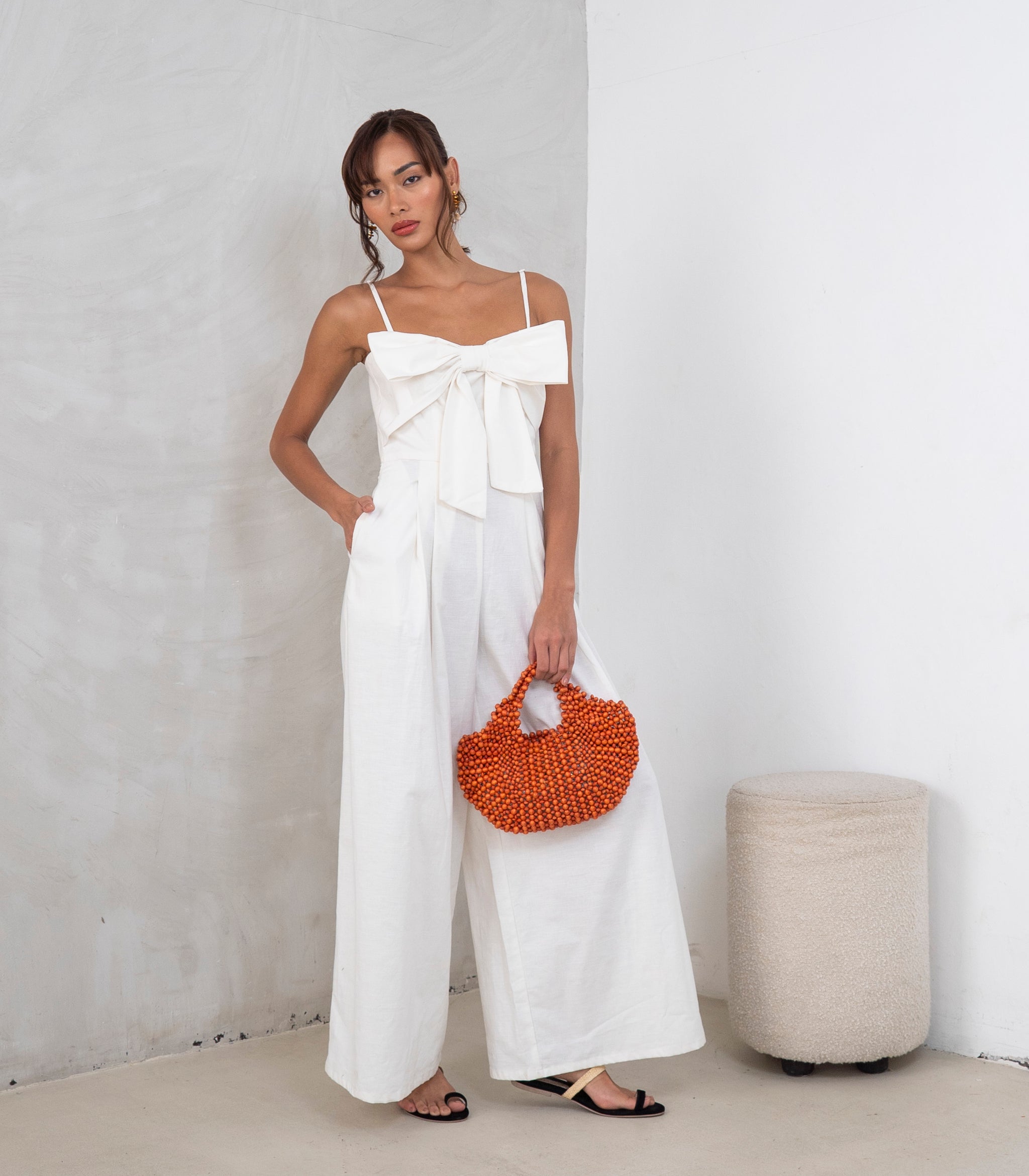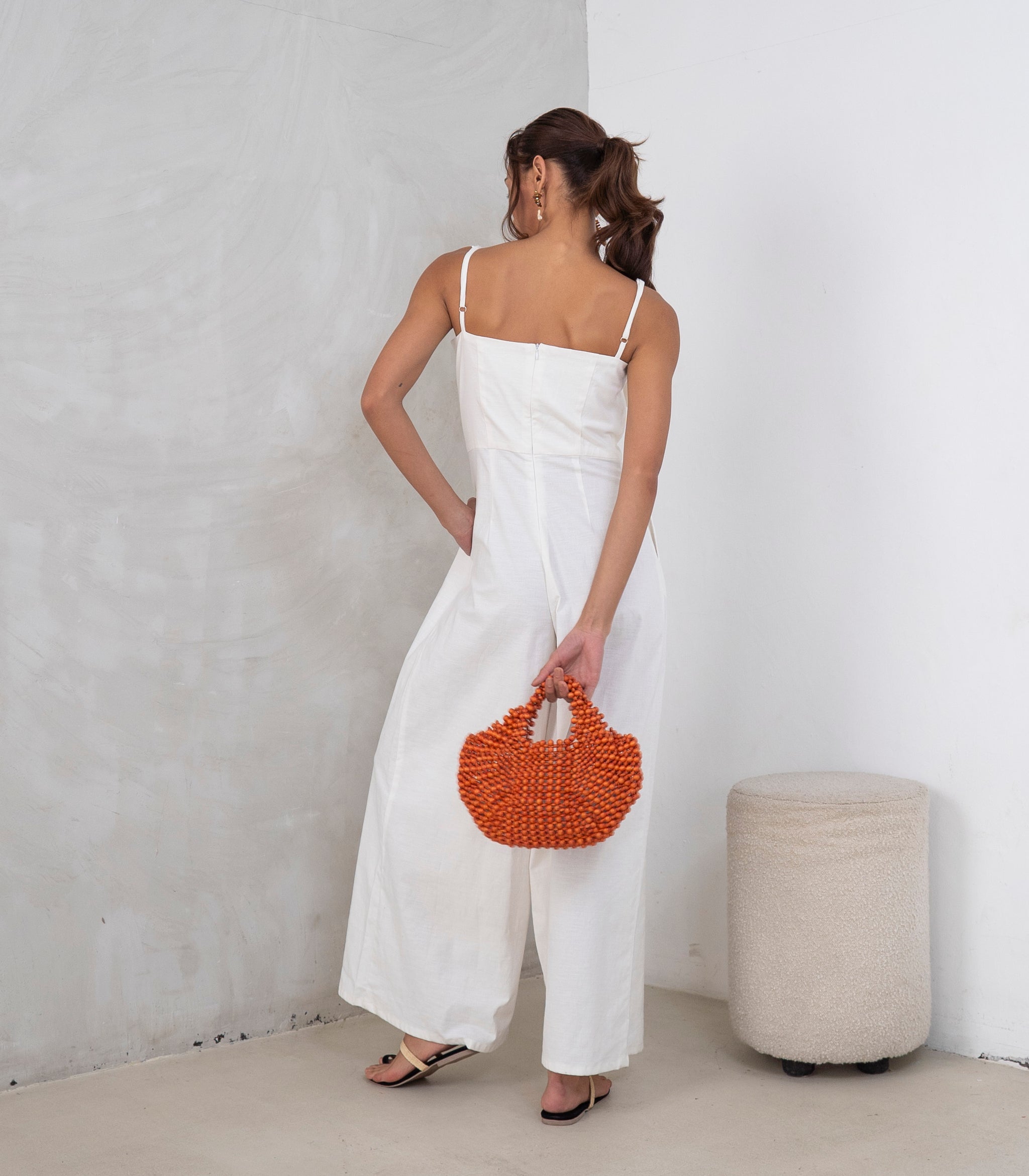 • A sleeveless wide-leg jumpsuit, cut from linen fabric.